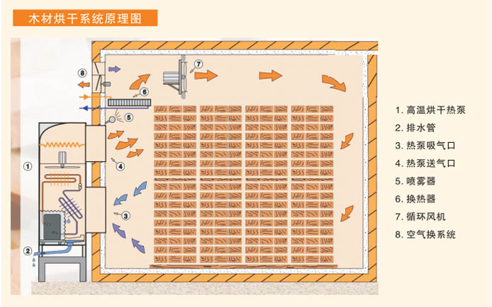 高溫熱泵木材烘干系統(tǒng)一方面使來自干燥室的濕空氣降溫脫濕,另一方面回收除濕過程中水蒸汽冷凝潛熱來加熱空氣,